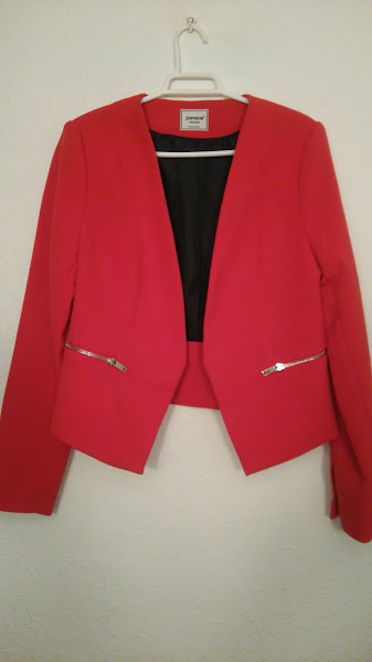 Siguiendo con la búsqueda de cosas para la boda, me hacía falta una chaqueta, que siendo mayo y de noche, no quería arriesgar. Después de mirar mucho en tiendas y online, no encontrar nada, ya que la mayoría eran con solapas, tipo americana, y creo que no le iban bien al vestido. Y aunque no encontré lo que buscaba, me decanté por esta que había visto en pimkie. La vi online y como pasé por una tienda entre a verla, y al final me la llevé. Es roja, con el detalle de las cremalleras y sin botones para abrochar, para llevar abierta. Es la talla L (creo que cada vez son más pequeñas, por cierto) y me costó 29,90€. Me sirve para otros vestidos que tengo, y con un vaquero o así, espero darle más uso.