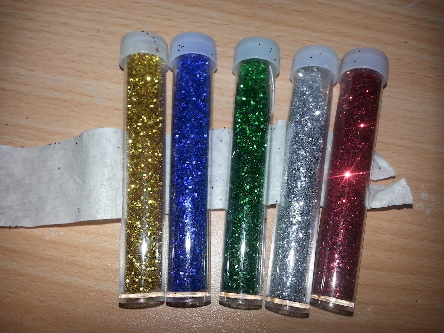 Cogí un pack en el que venían 5 tubitos de purpurina, Rojo, plata, oro, azul y verde. Me costaron 0,80€