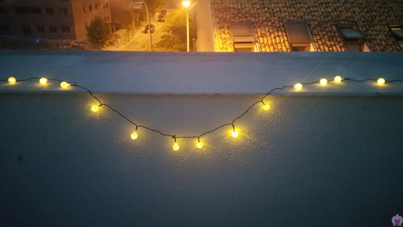 Me cogí estas luces que se cargan con la luz solar y me parecieron perfectas porque así no consumen nada y las puedes poner por la noche en la terraza y que queden la mar de bonitas. Son chiquititas y dan una luz tenue y cálida perfecta, además aunque sólo veáis un trozo, es una tira de luces bastante larga.