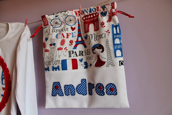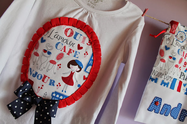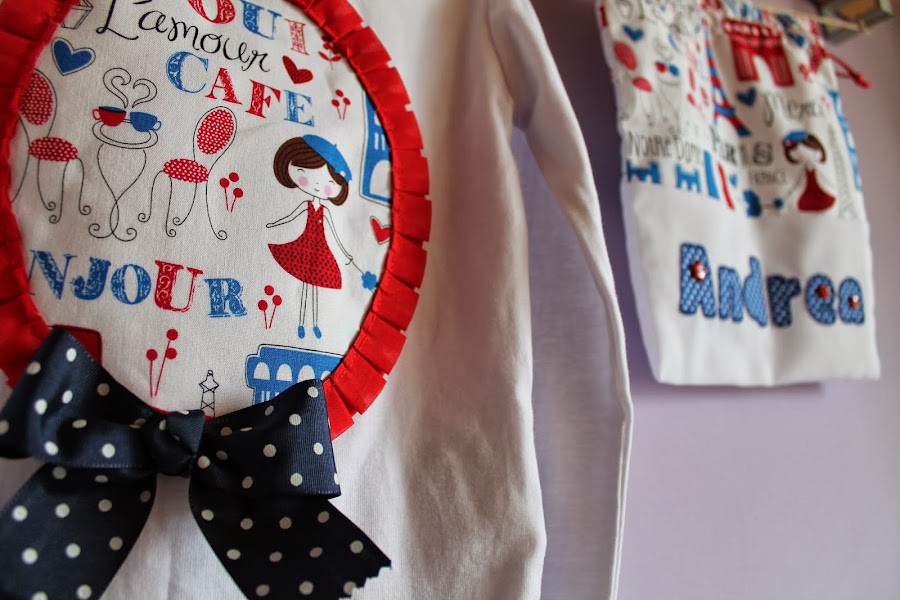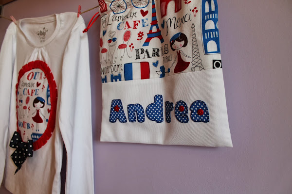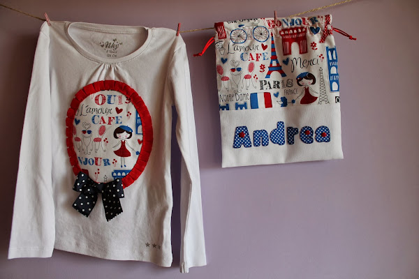 Y como no he publidado nada desde el día 10 de diciembre (madre mía! tanto tiempo???) ahora tengo muchas cositas nuevas que enseñaros, jeje y hoy os traigo un conjunto de camiseta, bolsita de merienda y pinza todo a juego con una tela que me encaaaaanta, con estampado muy chic y parisino, espero que os guste. La pequeña Andrea seguro que estará moníiisima con su conjunto.