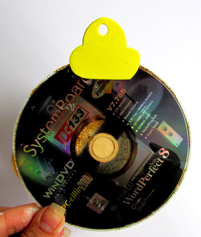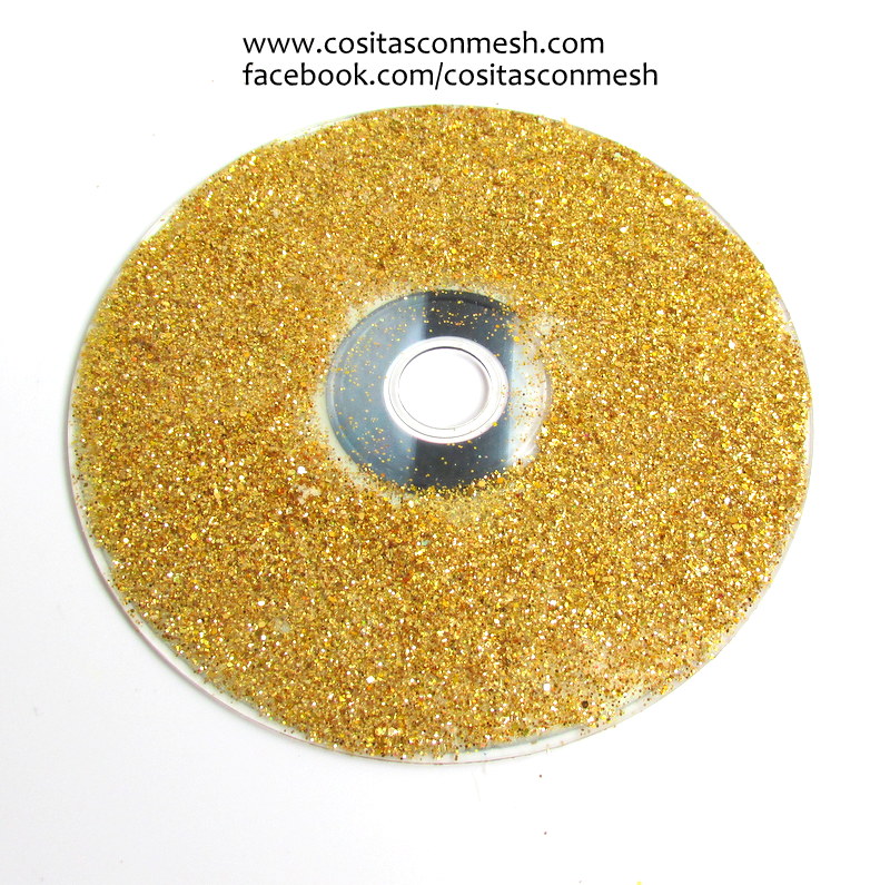 ** Recicla tus cds, decoralo con brillantina o con foami, yo lo que hice fue aplicar pegamento blanco con los dedos, luego rocie diamantina dorada, deje secar por unos minutos.
