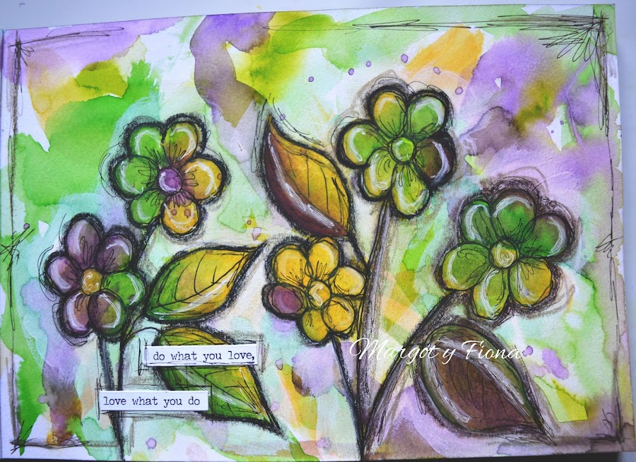 Comenzando con un fondo coloreado con acuarelas, secando entre cada color para evitar mezclas, hice unas flores sencillitas que luego repasé con marcador negro ( Micron).