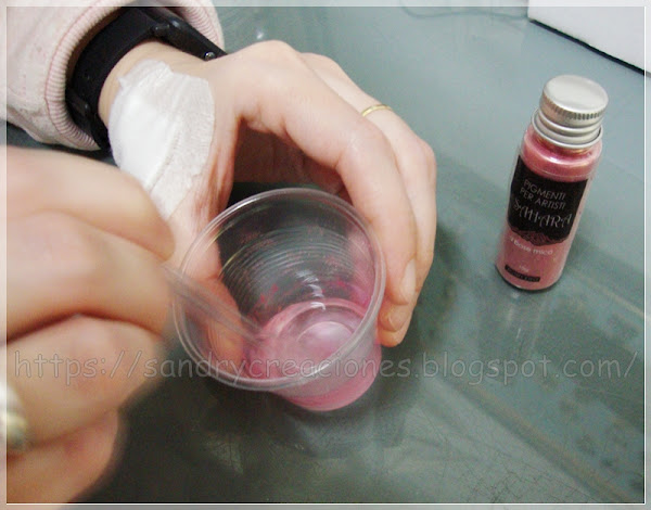 Paso 1. Preparación de la resina. En un recipiente desechable (vaso de plástico, etc...) hacemos la mezcla de los dos componentes de la resina, los mililitros necesarios de cada componente para realizar la mezcla correctamente nos los facilita el fabricante, con esos datos podemos saber con unas sencillas operaciones cuánto necesitaremos de cada componente para la cantidad de mezcla que queramos hacer (nosotros usamos la Resina Epoxi Liquidisima de ResinPro cuya mezcla es de 100 de componente A por 60 de componente B). Para realizar la mezcla haremos las operaciones necesarias y en nuestro caso queríamos poca cantidad con lo que hicimos 5ml del componente A y seguidamente 3ml del componente B para una mezcla de 8ml. Para verter los componentes en la medida exacta usaremos una báscula donde pondremos el vaso de plástico, pondremos la tara a 0 y primero pondremos el componente A hasta los 5gr y seguidamente verteremos el componente B hasta llegar a los 8 gr. Una vez puesta la cantidad exacta de los dos componentes mezclaremos bien, no muy rápido para que no salgan burbujas y dando vueltas en todas direcciones durante 45 segundos. Seguidamente, añadiremos el pigmento de color, en nuestro caso con un poco de pigmento rosa conseguimos un color rosa suave que nos gustó. Seguimos mezclando bien y tras 45 seg más mezclando ya tenemos la mezcla de resina epoxi preparada.