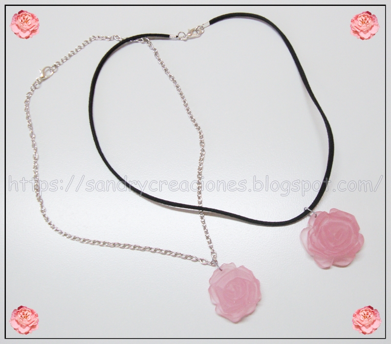 Pasamos el cordón y la cadeneta por las anillas que hemos colocado en las rosas y con esto terminamos el montaje de los dos colgantes, así es como quedaron: