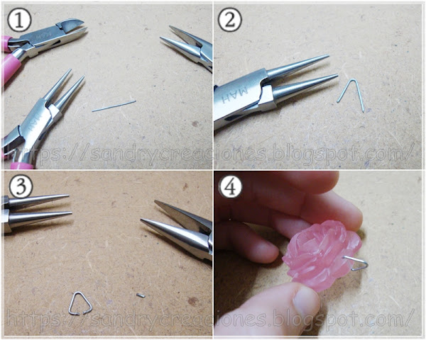 Paso 6. Montar el colgante. El primer paso del montaje será colocar una anilla en el agujero de las rosas, nosotros lo hicimos con alambre de plata e hicimos una anilla triangular.