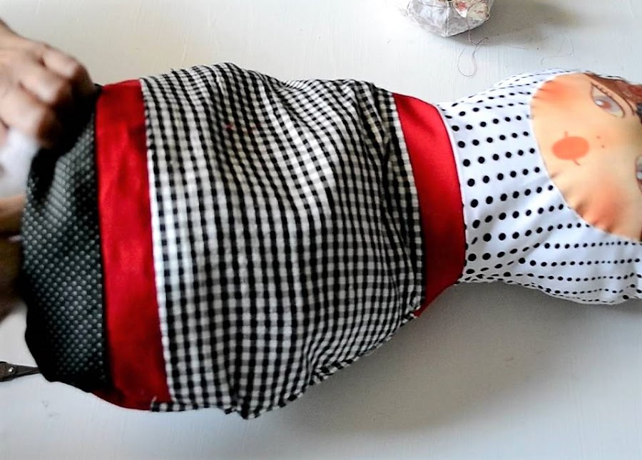 Lo siguiente es unir en el orden que queramos las telas. Yo te puesto arriba la de lunares negros sobre tela blanca y dejo 24 cm de esta tela, suficiente para poner la cara y que nos quede tela visible, a esta uno una tira roja y luego el cuerpo que es la de cuadritos vichy, de esta pongo 21 cm, otra vez una tira roja y luego la base en la tela negra con pequeños lunares blancos.