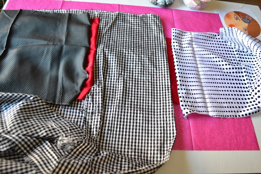 - Varias telas. Yo he elegido en blanco y negro, cuadros vichy, lunares negros sobre blanco y negra con pequeños lunares blancos. Además una tela roja. Todas mis telas son de telas Divinas.
