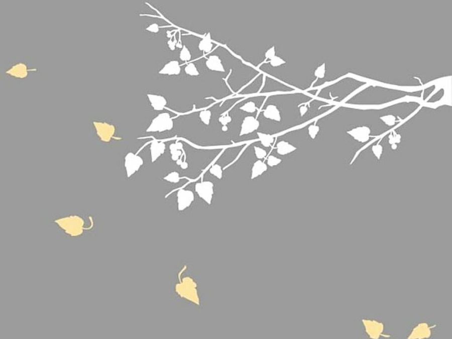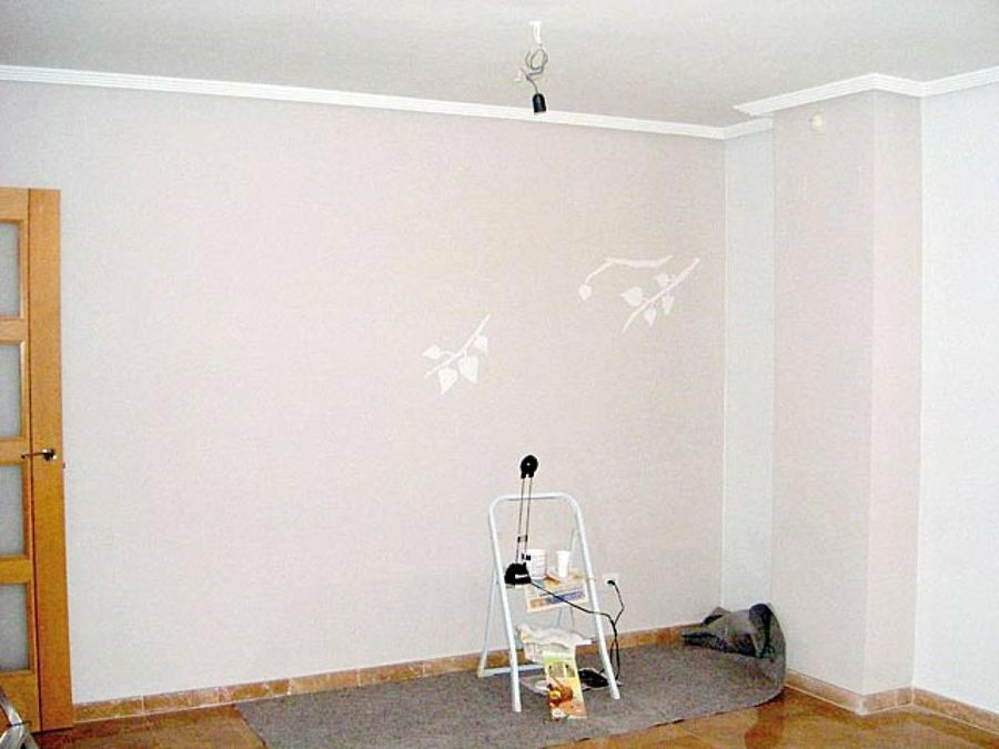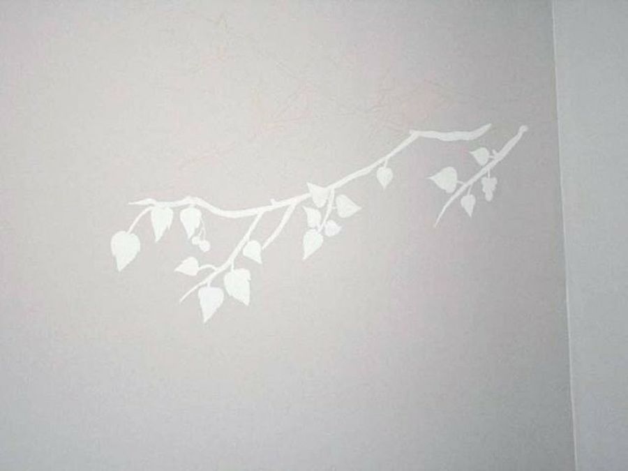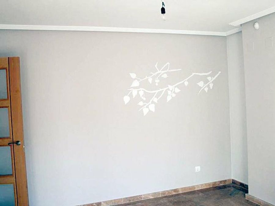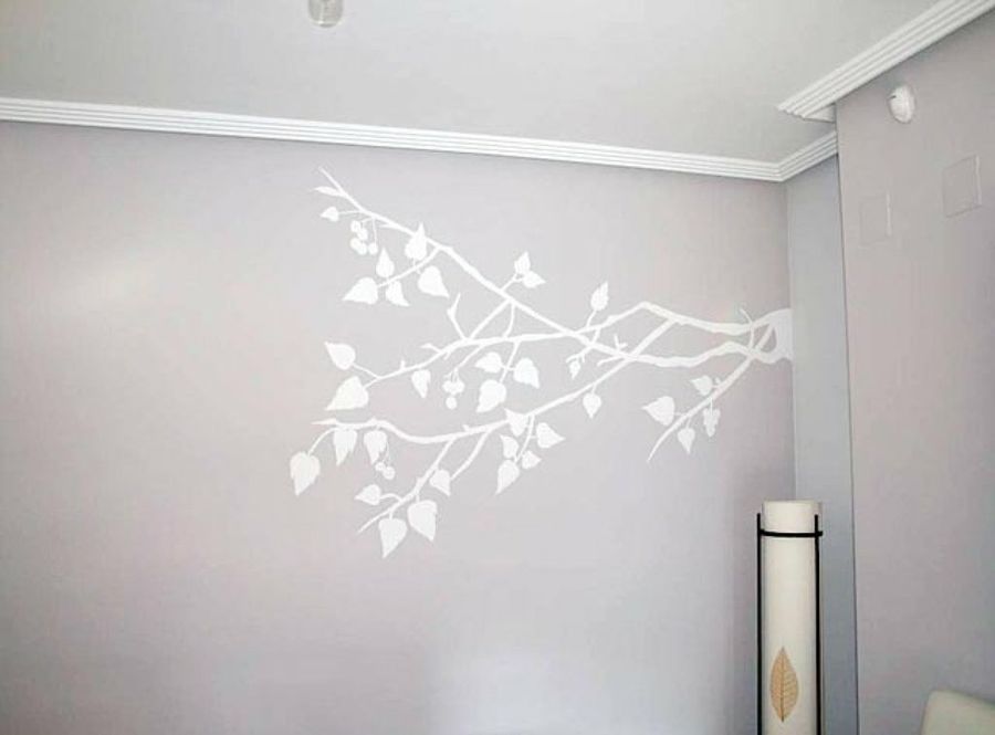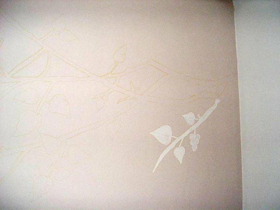 "No se aprecia bien, pero hay tres grupos de hojas que están rematados; tuve que perfilarlos en el gris de la pared, porque la pintura es menos densa que la blanca y se trabaja mejor los detalles".
