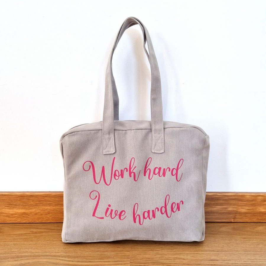 Esta semana te traigo un tutorial de costura de esos que me gustan a mí: un bolso muy práctico en el que cabe de todo. Bueno, en el mommy bag que compartí hace poco sí que cabe de todo, en este caso es un bolso un poco más compacto, pero igualmente práctico.Hace tiempo que quería hacerme un bolso para llevar la tablet al trabajo, donde me cupiera además el cargador y el ratón, la agenda, el móvil, documentos y algunas cosas más. Así que me he puesto manos a la obra y me ha quedado la mar de cuqui. Está mal que yo lo diga, pero me parece ideal con esas letras en vinilo que le he puesto en el frontal.