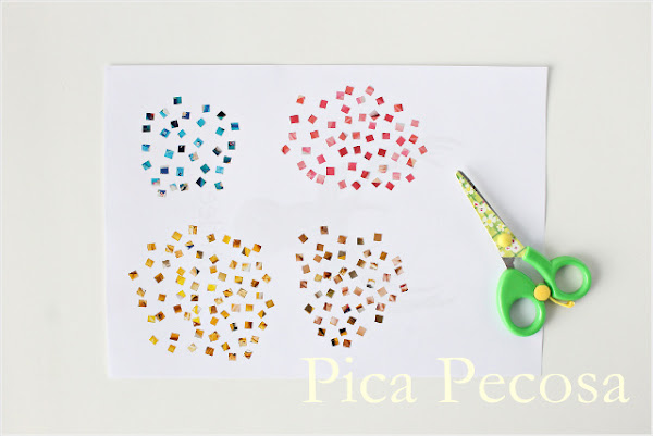 - Tijeras y pegamento en barra: Para recortar las teselas (los cuadraditos que forman el mosaico) y pegarlas, respectivamente.