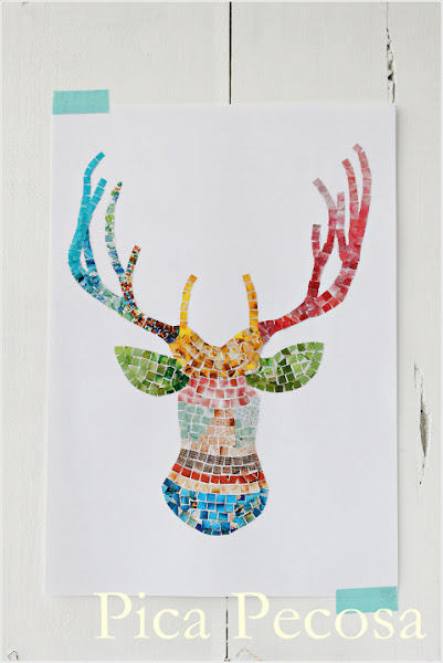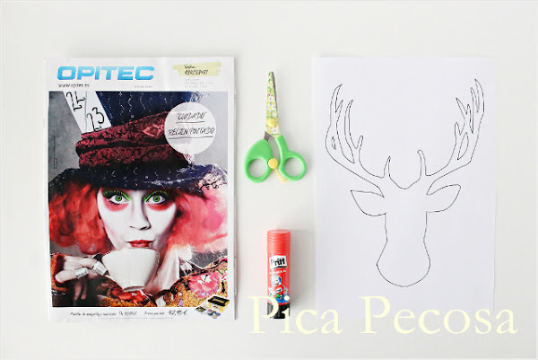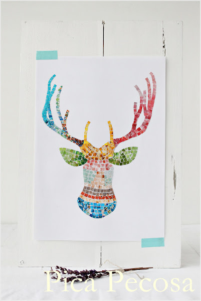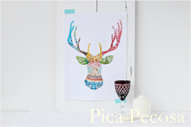 Como su propio nombre indica, en este reto había que reciclar el catálogo de Opitec, y yo lo utilicé para recortar las teselas con las que hice este mosaico con la forma de una cabeza de ciervo: