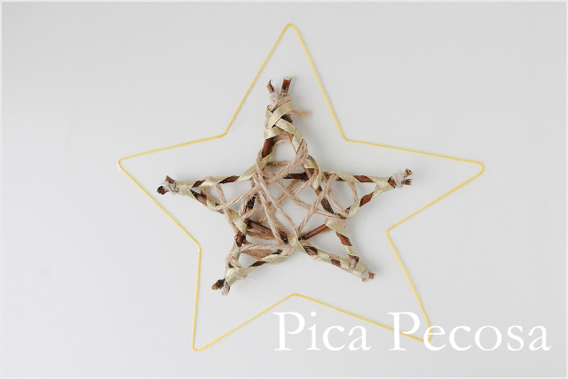 Si quieres más ideas para hacer estrellas con palos de madera, en el blog Papelísimo tienen una pintada en dorado y adornada con hilo.