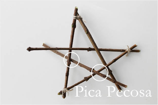 Es tan fácil de hacer que no necesitarías el tutorial porque sólo hay que unir los cinco palitos por los extremos, amarrándolos con el cordel y formando la figura de una estrella, pero te enseño las fotos para que no te entren dudas y la hagas en un periquete.
