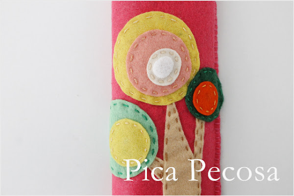 # Paso 5: Tomar las medidas del cartón y hacer una funda de fieltro que lo cubra. Si quieres poner algún adorno, este es el momento. Yo hice un árbol y luego le puse un pájaro en el cierre, como en esta funda de móvil (aquí), pero puedes usar el motivo que más te guste, o dejarlo liso tal cual. Recuerda dejar 1 cm. de más en los bordes para que entre con facilidad en el cartón: