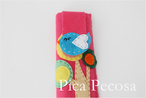Aproveché su forma alargada para coser un tronco de un árbol y en la parte móvil de la que se tira para sacar la regla, puse un pájaro. ¿Puedes ver dónde he cosido el fieltro de cierre? ¿Te has fijado en el centro del árbol, en el círculo blanco?:
