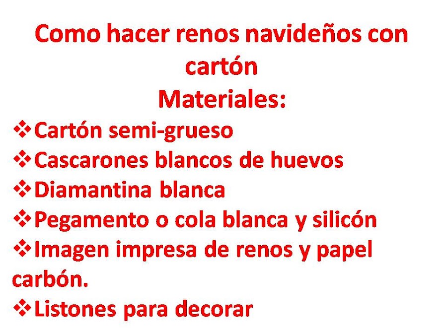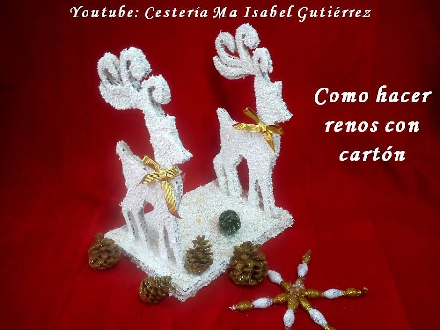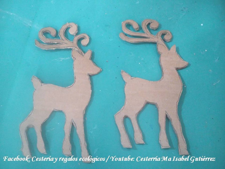 Y encima, la imagen de los renos. Estas imágenes de renos podemos buscar en internet, descargar las que mas nos gusten, y en el programa word, reducimos o agrandamos al gusto e imprimir. Si no deseas batallar con eso, puedes ir a un local de internet y ahí mismo te los imprimen... con un bolígrafo de punta dura dibujamos el contorno de los renos...