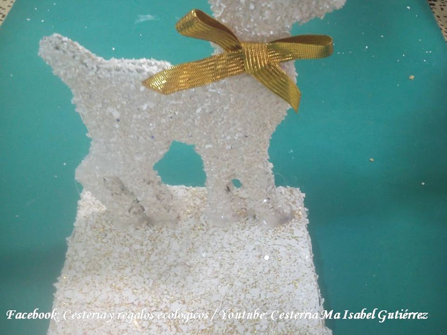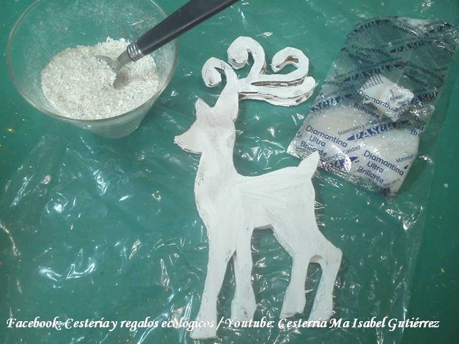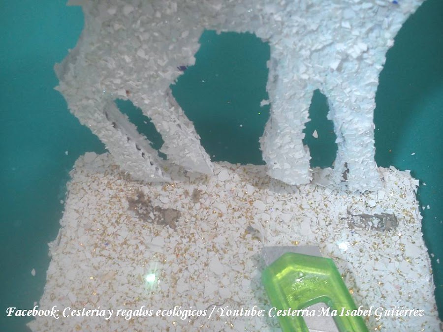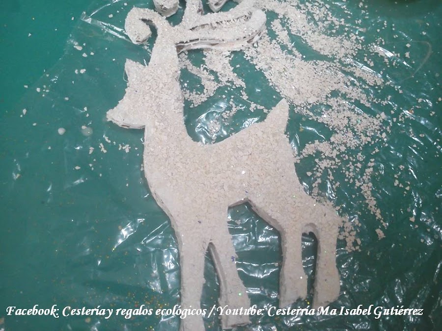 A los cascarones triturados agregamos un poco de diamantina dorada, esto le dará un lindo brillo a los renos... cubrimos toda la pieza alrededor...