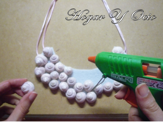 6. Pegamos una a una las caracolas sobre el fieltro con la pistola de silicona.