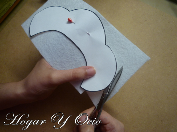 2. Trasladamos el dibujo de papel al fieltro con ayuda de un alfiler. A continuación, cortamos el fieltro siguiendo la silueta del molde.