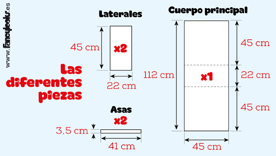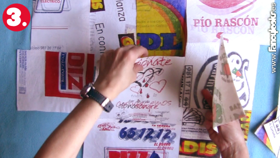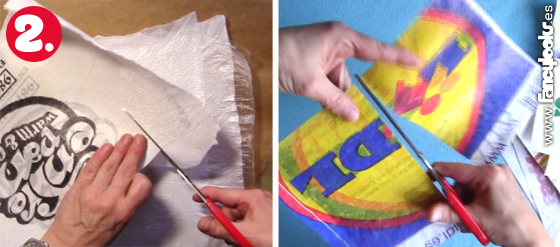 1. Primero se forman las distintas láminas pequeñas que luego uniremos para formar otras más grandes. Para ello, prepara tres bolsas del supermercado, de tamaños parecidos, poniéndolas planas y córtales las asas y la tira del fondo. Ponlas una encima de la otra y el logotipo que quieras resaltar en la parte de arriba. Cubre todo con la parte transparente de una bolsa de la fruta. Tapa con un papel del horno (para que no se te pegue todo a la suela de la plancha) y con la plancha puesta entre la graduación 2 y la 3, la del algodón, plancha moviendo el aparato sin pararte o te reducirá mucho y deformará la lámina. Plancha hasta que las capas de plástico quedan sólidamente unidas. Cada vez que pares de planchar, pon rápidamente un libro grande y pesado encima de lo planchado para que enfríe de forma plana, sino el plástico tiende a quedarse arqueado por zonas, como a bultos. Prepara otra tanda y sigue haciendo. Finalmente necesité unas 28 de estas láminas para formar toda la bolsa. 2. Corta cada lámina para rematarla con bordes rectos. Las láminas de bolsas grandes las corté hasta por la mitad, no me importaba cortar el logo de la bolsa por el medio si era muy grande, así la composición final queda más homogénea y colorida. 3. Coloca las láminas solapándolas como 1 ó 2 centímetros para formar una lámina más grande, plancha y sigue solapando y uniendo las piezas de plástico preparadas hasta formar las tres piezas que compondrán la bolsa. Cuando las tengas preparadas, cúbrelas con trozos de bolsa transparente por delante y vuelve a planchar, y con trozos de bolsa con el logotipo hacia dentro por detrás y vuelve a planchar, esto reforzará aún más las uniones entre láminas. Os dejo aquí los esquemas de referencia que preparé para la mía: