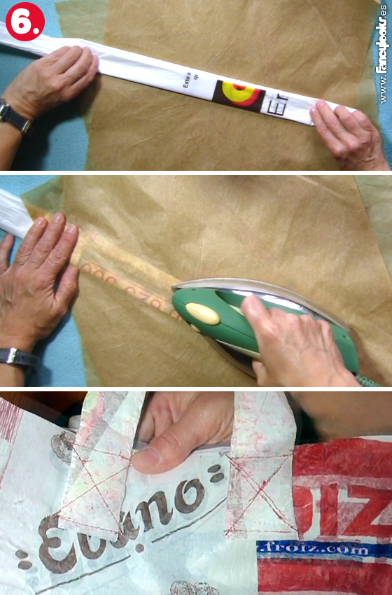 Recomiendo usar puntada larga para no dañar demasiado el plástico de las piezas, si se hacen puntadas cortitas eso puede hacer que se perfore el plástico y se puedan rasgar fácilmente las costuras. Otro punto recomendable es el zig zag ancho, pues espacia más los agujeros. 6. Para las asas necesitarás dos bolsas más, una para cada asa. Córtales sólo la base y dóblalas hasta formar una tira larga, plánchala protegiendo con papel del horno hasta fundir las capas, envuélvelas con un poco de plástico transparente de las bolsas de la fruta y vuelve a fusionarlo con la plancha. Dales forma de asa y cóselas a la bolsa con unos puntos formando una cruz. Es recomendable coser las asas a la bolsa a la pieza central antes de coser el cuerpo de la bolsa, pero yo no me di cuenta y cometí el error de hacerlo después. Como la bolsa es un poco dura y un tanto rígida me resultó un poco difícil coserlas, pero aún así lo pude hacer.