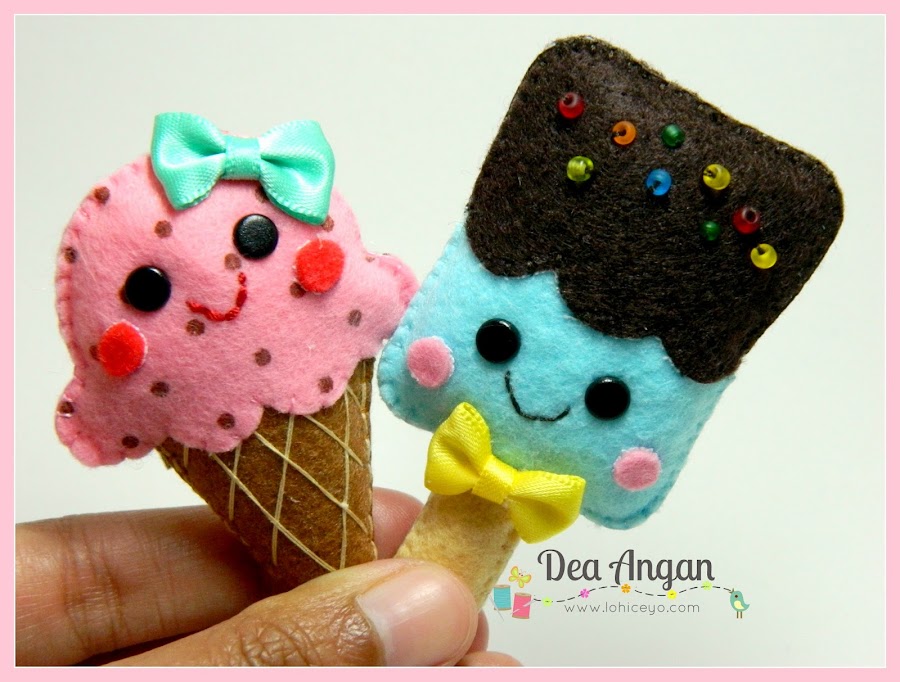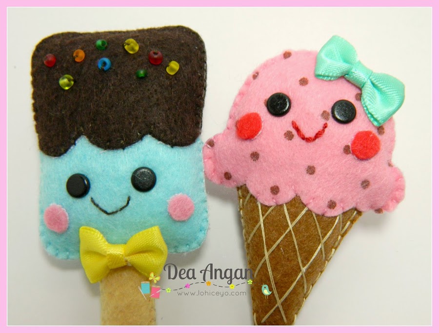 Quiero ensñarte al Sr. y Sra. Helados. Son helados de fieltro y son broches. Me parecen chulos para llevarlos luego en el verano, mientras tomo un helado de vainilla en la playa. Ya falta poco :p