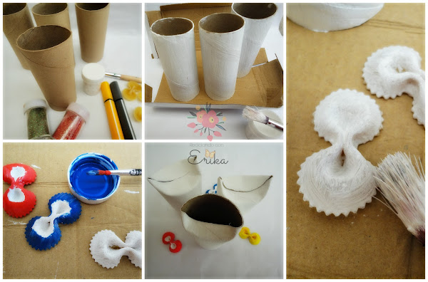 Pintar los tubos de cartón de color blanco , pintar las moñas del color deseado ; dejar secar muy bien , luego pegar la moña con pegamento como se muestra en las imágenes , dibujar con los plumones o marcadores los detalles de ojos, nariz y bigotes .