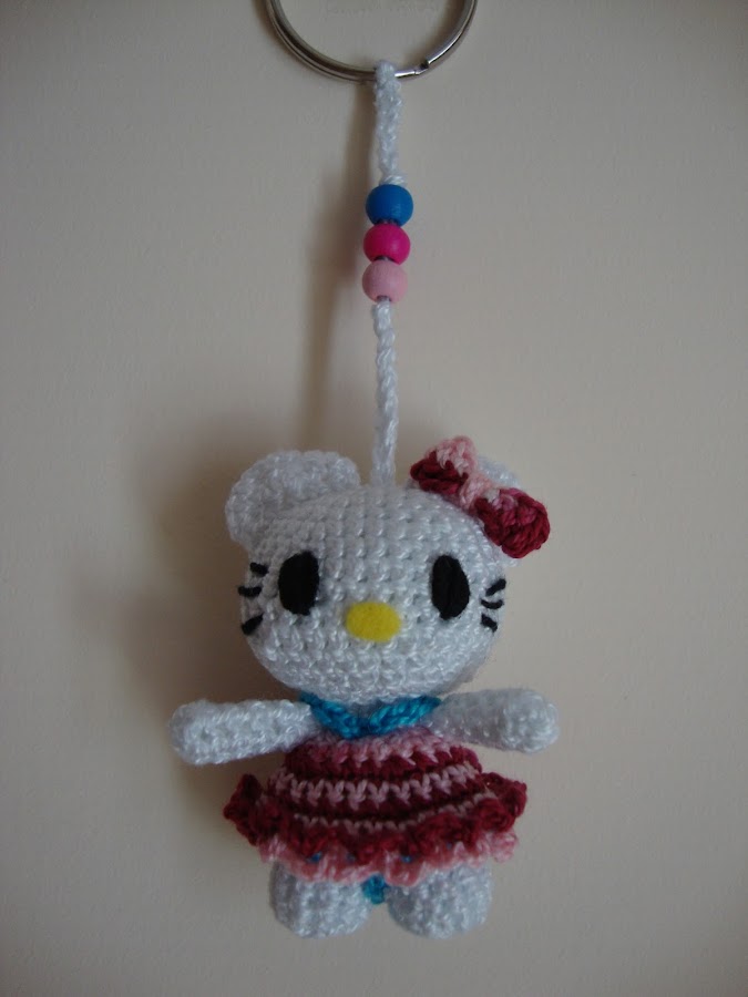 Para el colgante una cadeneta con hilo doble y unos abalorios en los mismos colores del atuendo, unida al final a una arandela de llavero para que la pueda llevar a todas partes.