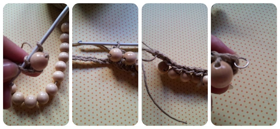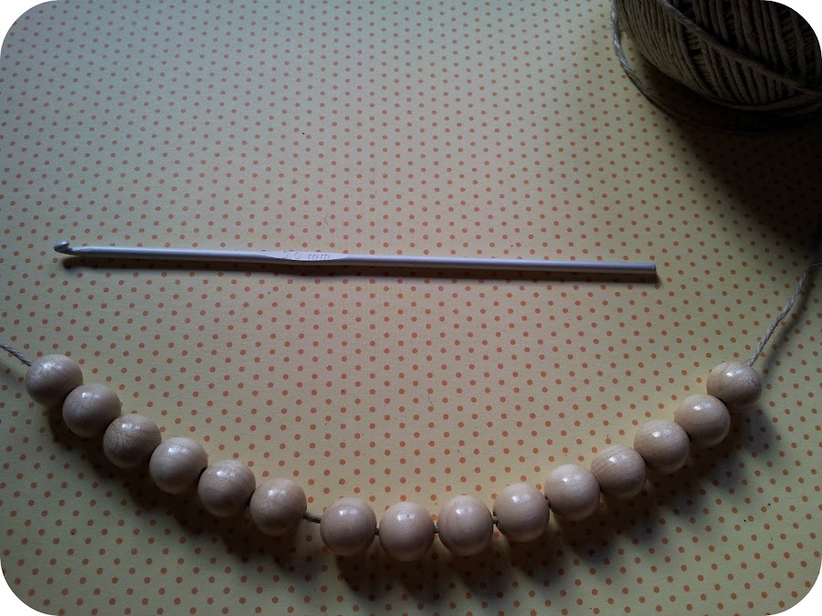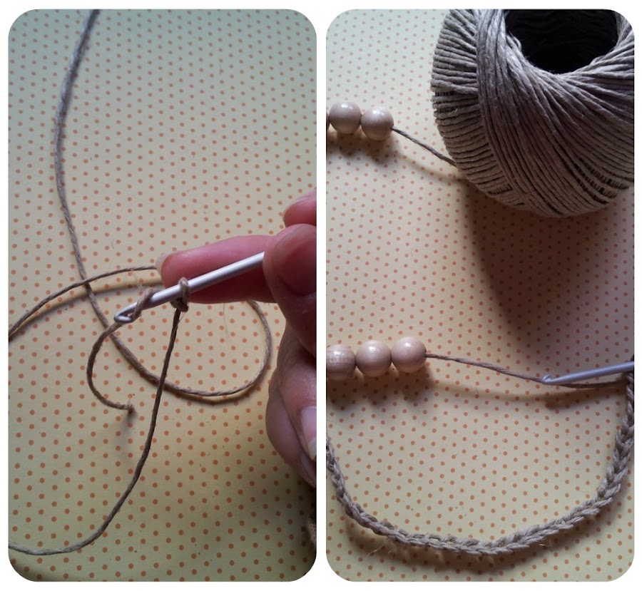 2) Vamos a usar de nuevo la técnica del crochet o ganchillo. No es nada complicado, así que no hay que tenerle miedo. Cuanto más lo practiquéis, mejor. Vamos a comenzar haciendo 30 cadenas (dos cadenas por cada bola o cuenta, es decir, que si sólo usáis 10 bolas, tendríais que hacer 20 cadenas).