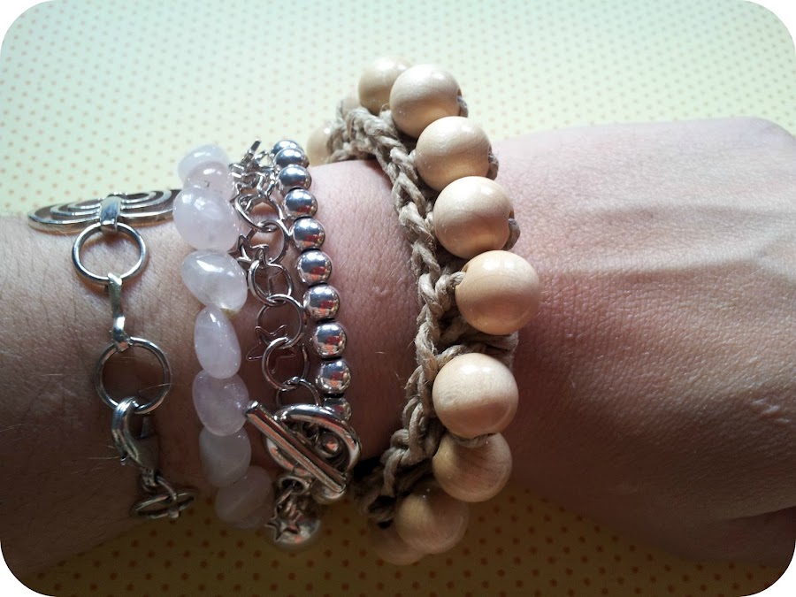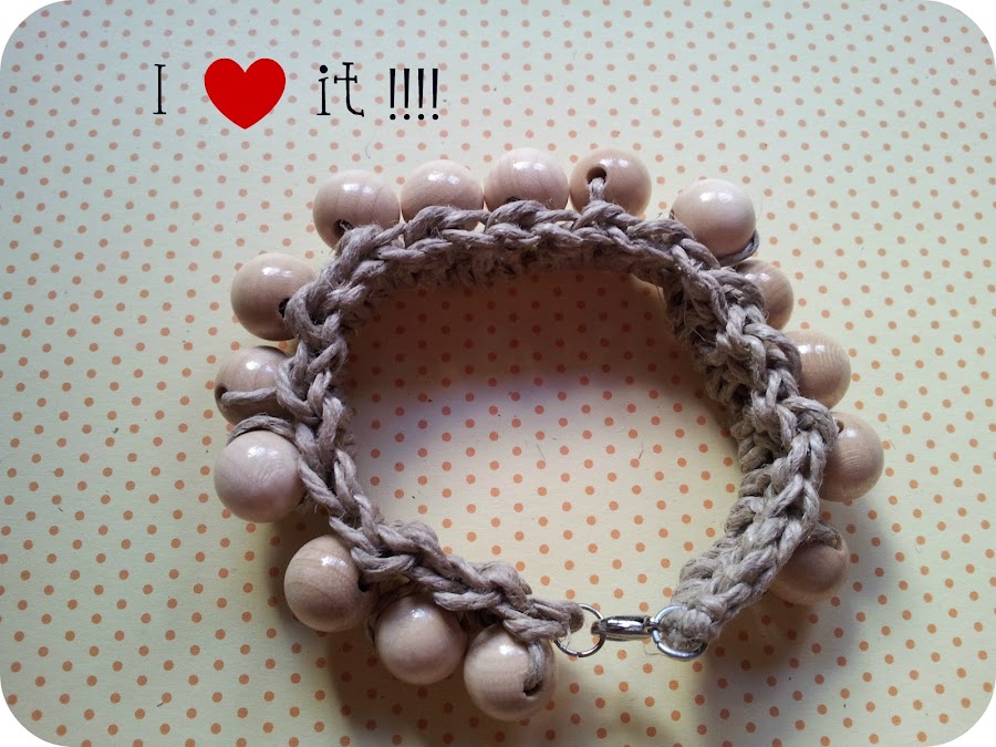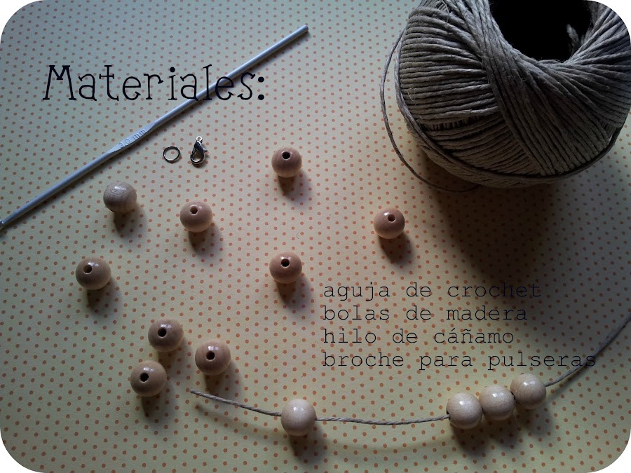 1) Empezamos introduciendo las cuentas de madera en el hilo de cáñamo. Este hilo me fue un poco difícil de encontrar en mi ciudad, así que el ovillo me lo traje de Eindhoven. Allí lo venden en tiendas de manualidades e incluso en cualquier supermercado. Las bolitas de madera los compré en una tienda de abalorios muy famosilla que hay en unas galerías en el centro de Málaga. He usado 15 bolitas, suficiente para el contorno de mi muñeca.