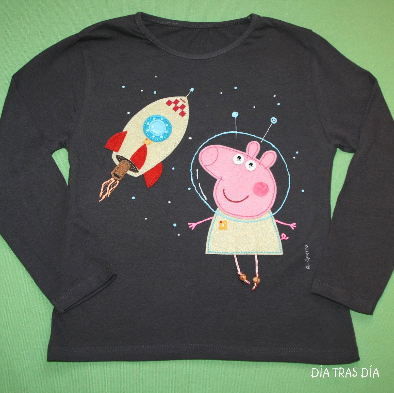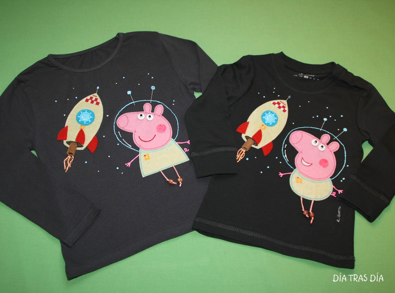En primer lugar, os enseño las camisetas que me encargó Mónica (que ya repetía como clienta). Al principio, me planteó que quería una camiseta de Peppa con Teddy para su peque Laura y una de George con su dinosaurio para su hijo Álvaro. Pero después de darle vueltas al asunto, llegó a la conclusión de que a Álvaro realmente quien le gustaba era Peppa, así que igual cuando viese la camiseta de su hermana, le iba a gustar más que la suya. Y la solución planteada por Mónica fue realmente salomónica: vamos a hacer las camisetas para los dos iguales, de forma que lleven tanto a Peppa como George, los dos con sus mascotas.
