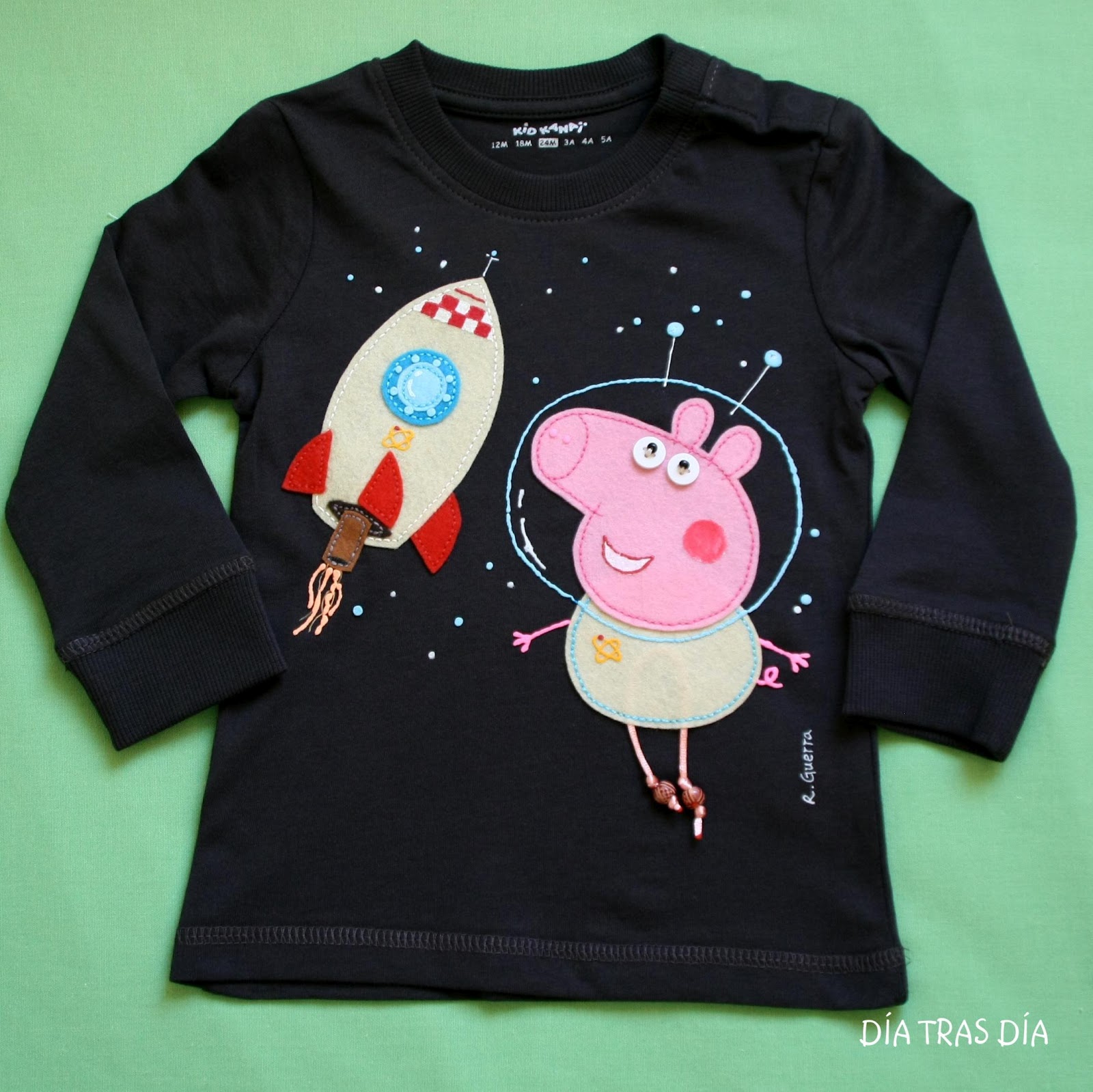 El segundo encargo fue realizado por Eva, otra clienta que también repetía (buena señal), que cuando vio la camiseta que hice para Iván con George astronauta y su cohete, quiso que le hiciese unas camisetas iguales para sus dos peques, Laura y Alonso, con este mismo dibujo. Pero ella ya me hizo el encargo con visión de futuro y, pensando en el próximo invierno, me pidió que fuesen de manga larga y sobre camiseta de color gris.