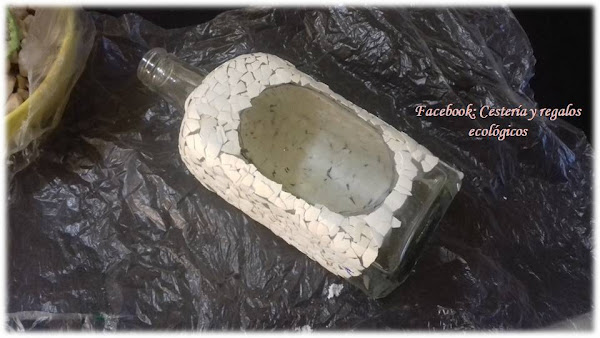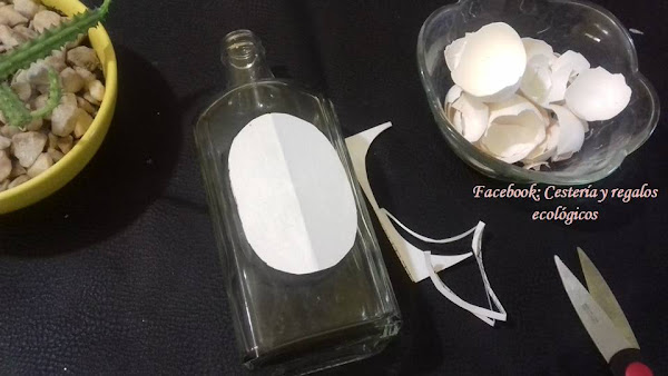 Alrededor de esta ventana ovalada, y en el resto de la botella, pegamos pedazos de cáscaras de huevos...