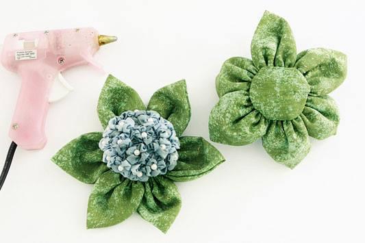 Pegamos todo juntos con la silicona caliente y nuestra hermosa hortensia de tela drapeada está lista.