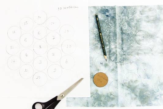 Dibujamos en la tela círculos de 5 cm de diámetro. Se ocupará con el drapeado 30 x 30 cm de tela.
