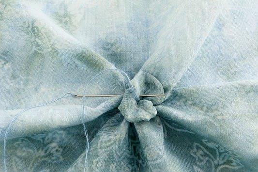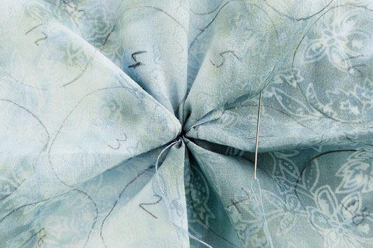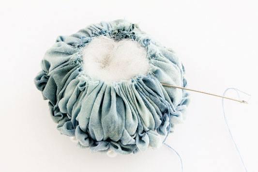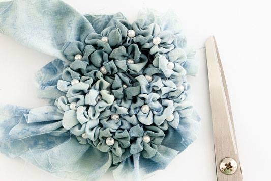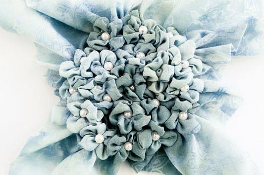 Empezando por el círculo uno drapeamos la tela. Para esto cosemos los contornos de cada círculo con la puntada suelta. Luego ajustamos el hilo dejando que la tela “abombada” se quede en el lado de la cara de nuestra preparación. Pasamos la aguja hacia la bolita de tela y le damos unas puntadas que la dividen en cuatro partes- 4 pétalos de hortensia. En el centro pueden fijar una perlita o mostacilla.