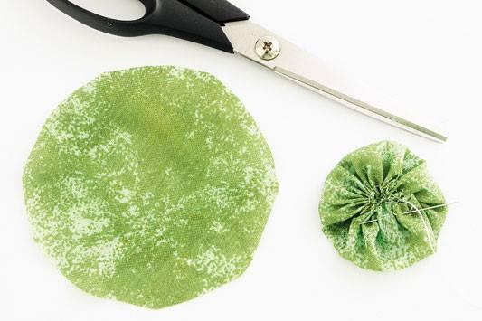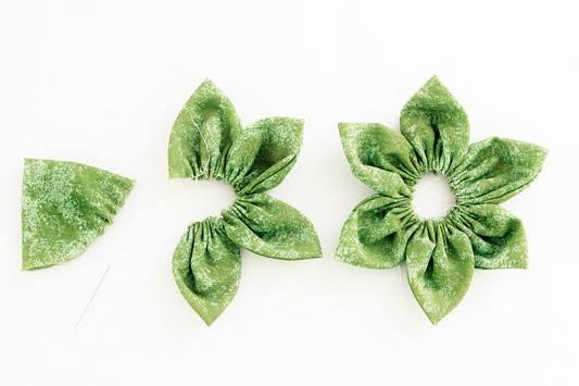 Cortamos la tela verde en círculos. Cada círculo doblamos dos veces por la mitad y cosemos la parte inferior ajustando luego el hilo. Juntamos 6 hojas verdes para que tengan la apariencia del sépalo de la hortensia. Tapamos la parte inferior con una preparación circular de la tela verde rellena ligeramente con napa.