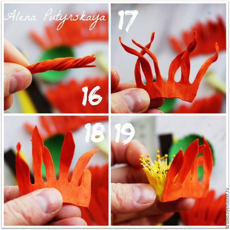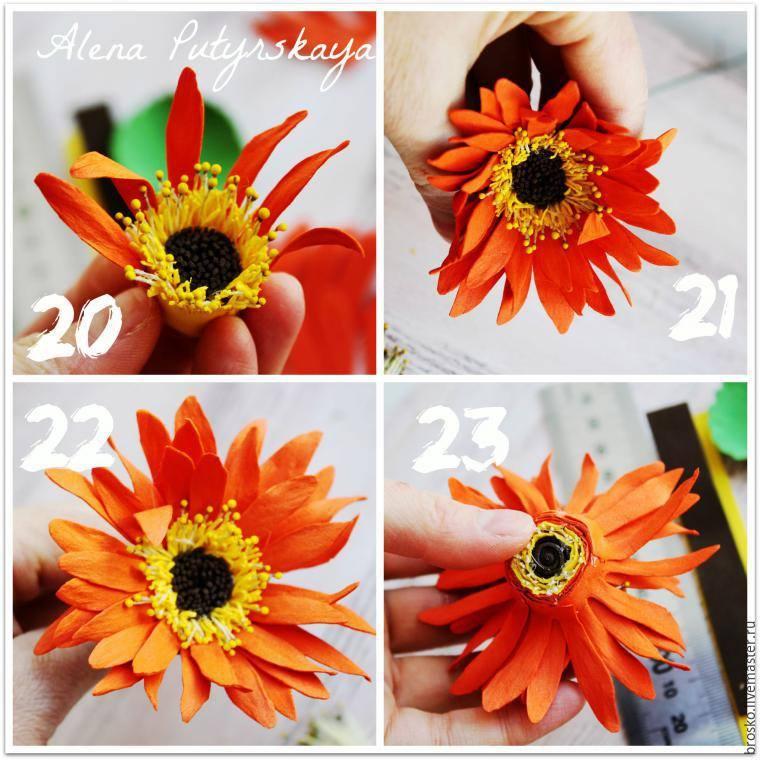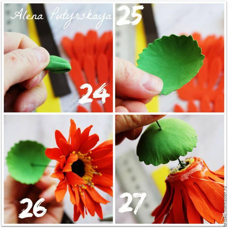 Hoy quiero compartir con ustedes este hermoso paso a paso de Alena Putyrskaya que nos enseña a elaborar una preciosa gerbera de foami (goma EVA) que parece ser de verdad. En la primera imagen pueden ver los moldes para recortar de foami de 1 mm de grosor.