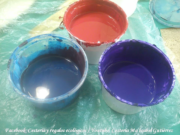 Para pintar podemos utilizar pintura acrílica, pero recomiendo usar la pintura vinílica con base de agua (es la que se utiliza para pintar paredes) porque es económica y rinde mucho y podemos combinar entre sí los colores para obtener nuevos tonos, como en este caso, combiné rojo y azul y un poco de agua para obtener el color uva...