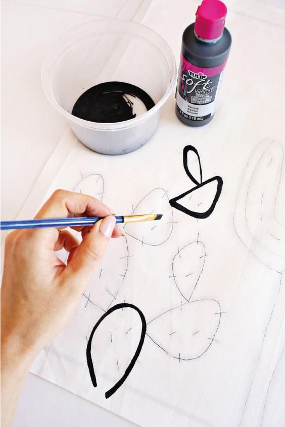 Una vez trazado todo el diseño en la tela, es hora de comenzar con la pintura. Puedes dejar el papel debajo para no manchar la mesa.