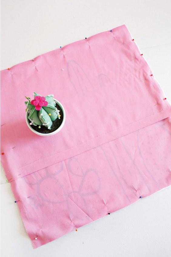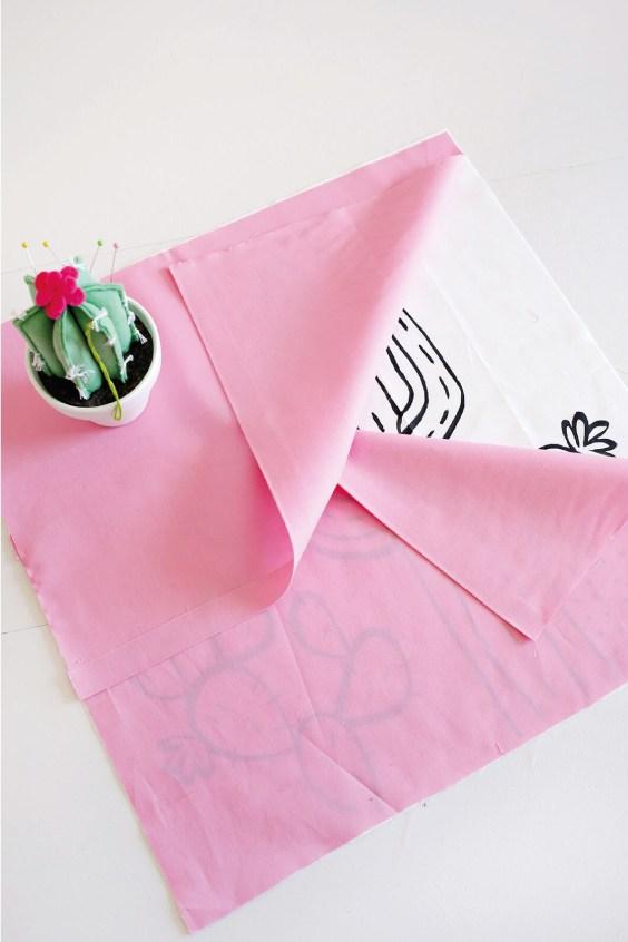 Cortar un cuadrado de tela de 48 cm de lado para que, al coserla quede de 45 o 46 cm.