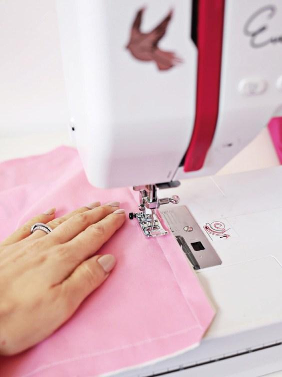 Coser alrededor de todo el cuadrado a 1 y 1/2 cm de distancia del borde. Cortar las cuatro esquinas como muestra la imagen para que queden más prolijas al darla vuelta.