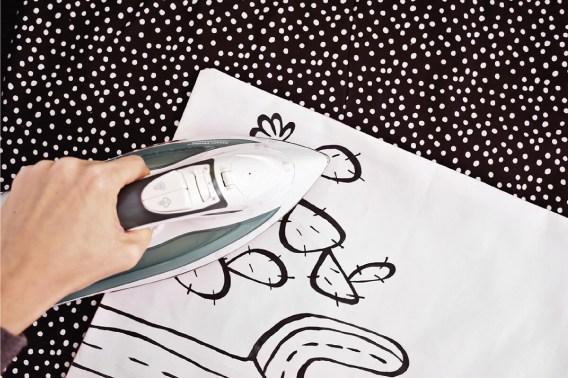 Esta funda es fácil de hacer, se calca el dibujo, se pinta de manera sencilla con pintura acrílica negra y pincel, se cose alrededor y se forra el almohadón. Para esta parte, si te das maña con la costura, excelente! Sino puedes comprar una funda lisa y pintarla, o reciclar alguna que tengas y necesite un toque más actual.