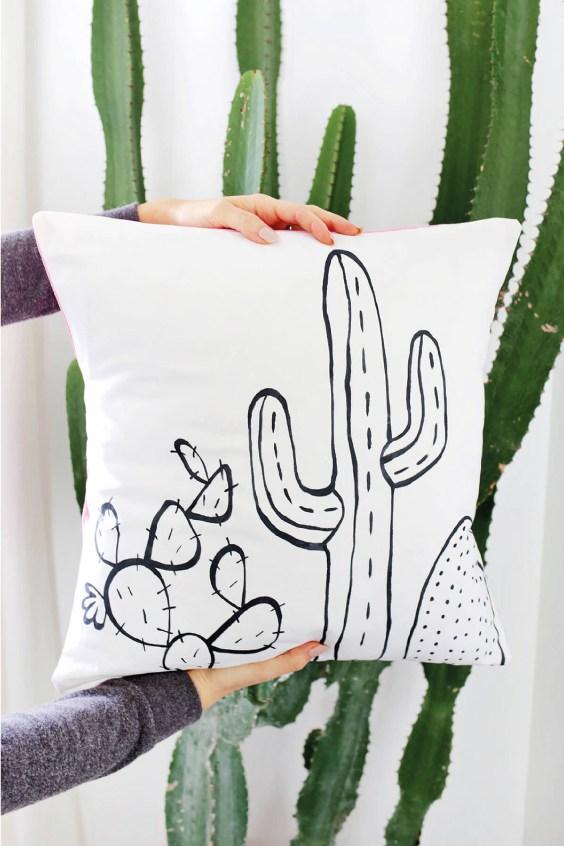 Si te gustan tanto los cactus y suculentas como a mi, no puedes perderte este hermoso DIY de la mano de “A Beautiful Mess”. Se trata de un cálido y moderno almohadón pintado a mano, en un solo color y sin máximos detalles, simplemente el contorno de la silueta de unos adorables cactus y listo! Un motivo muy actual para agregar a nuestro hogar.