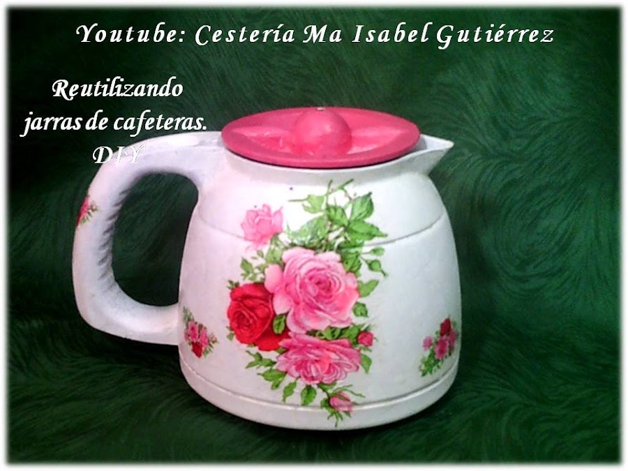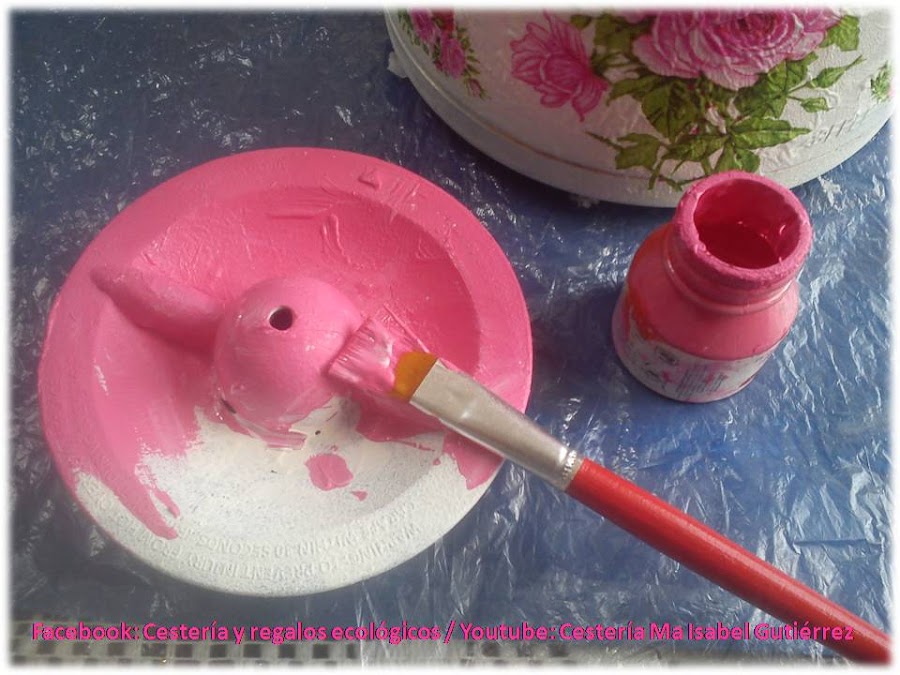 Si deseamos utilizar la jarra como meramente decorativa, pintamos la tapa, primero en color blanco y luego en un color a juego con el estampado de la servilleta, éstas son pinturas acrílicas... Por último, aplicamos una capa ligera de barniz transparente y estaría lista!