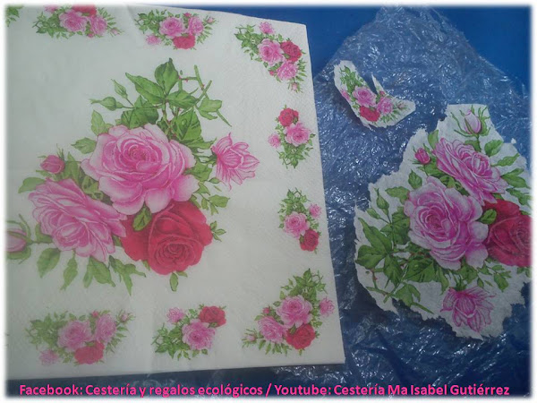 Ahora vamos a preparar las servilletas quitando las dos capas blancas que traen por detrás y recortando la imagen central, podemos hacerlo primero con tijeras y luego, con nuestros dedos, ir cortando alrededor, esto es para que al pegar, no se noten los relieves de donde cortamos...