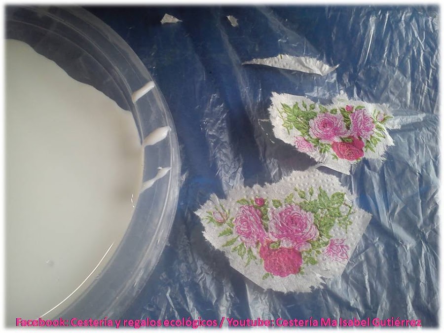 Ponemos el pegamento y aplicamos la servilleta, colocamos un hule encima y presionamos suavemente del centro hacia afuera, esto es para evitar que se formen burbujas de aire y se arrugue la servilleta.... lo mismo hacemos con las flores pequeñas que pegamos alrededor...