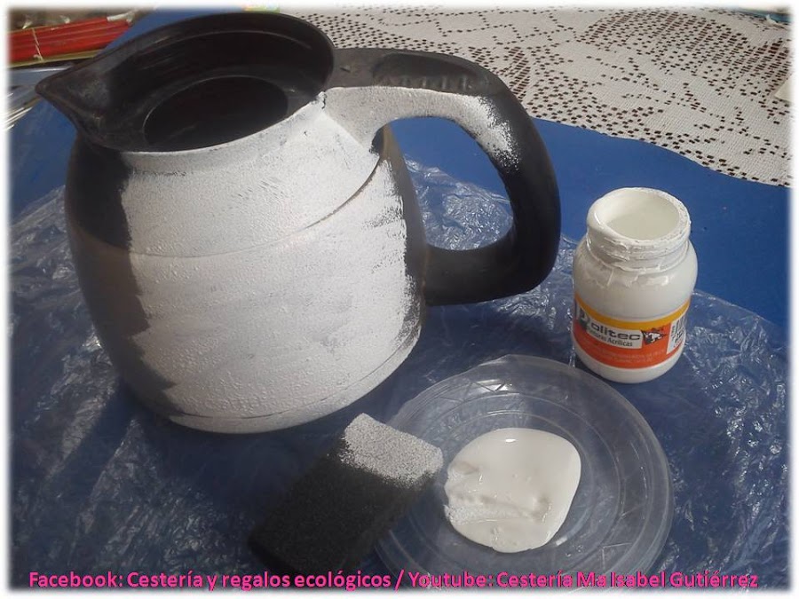 Como primer paso pintamos la jarra con pintura acrílica. El color de la pintura debe ser igual o similar al color que tenga el fondo de la servilleta que vamos a pegar, en este caso mi servilleta son flores con el fondo blanco. La pintura acrílica cubre muy bien el aluminio y el cristal, pero debemos pintar con un pedazo de esponja dando pequeños golpecitos para que el acabado sea parejo...