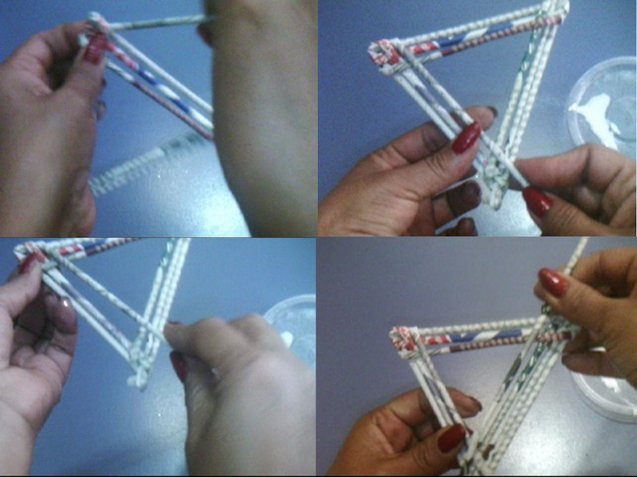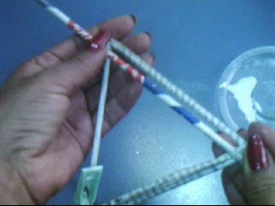 Paso 2. Formamos el triángulo con las medidas que marcamos en cada doblez, luego, el tramo de varilla que nos quedó, le ponemos un poco de pegamento y vamos a darle la vuelta con esta varilla a la esquina donde vamos a unir el triángulo...
