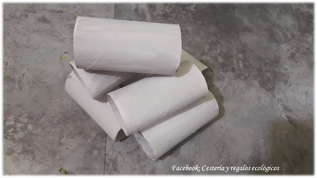 Ya pintados los tubos de cartón, los cortaremos en aros de aproximadamente 1.5 cms., de ancho...